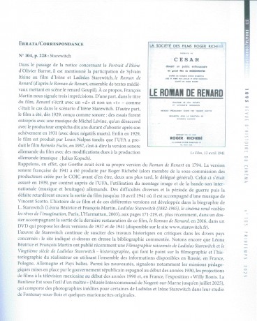 « Dans le passage de la notice concernant le Portrait d’Itkine d’Olivier Barrot, il est mentionné la participation de Sylvain Itkine au film d’Irène et de Ladislas Starewitch, le Roman de Renard (d’après le Roman de Renart, ensemble de textes médiévaux mettant en scène le renard Goupil). À ce propos, François Martin nous signale trois imprécisions. D’une part dans le titre du film Renard s’écrit avec un « d » et non un « t » – comme c’était le cas dans le scénario d’Irène Starewitch. D’autre part, le film a été, dès 1929, conçu comme sonore : des essais furent entrepris avec une musique de Michel Lévine, qu’un désaccord avec le producteur empêcha dix ans durant d’aboutir après son achèvement en 1931 (avec deux négatifs muets). Enfin en 1929, le film est produit par Louis Nalpas tandis que l’UFA a produit Reineke Fuchs, en 1937, c’est-à-dire la version sonore allemande du film avec les modifications dues à la production allemande (musique : Julius Kopsch). Rappelons en effet que Goethe avait écrit sa propre version du Roman de Renart en 1794. La version sonore française de 1941 a été produite par Roger Richebé (alors membre de la sous-commission des producteurs créée par le COIC avant d’en être, deux ans plus tard, le délégué général). Celui-ci s’était assuré en 1939, par contrat auprès de l’UFA, l’utilisation du montage image et de la bande-son internationale (musique et bruitages) allemands. Des difficultés diverses et la période de guerre puis la défaite retardèrent encore la sortie du film jusqu’au 10 avril 1941 où il est accompagné d’une musique de Vincent Scotto. L’histoire de ce film et de ses différentes versions est développée dans la biographie de L. Starewitch (Léona Béatrice et François Martin, Ladislas Starewitch (1882-1965), Le cinéma rend visibles les rêves de l’imagination, Paris, L’Harmattan, 2003), aux pages 171-219, et, plus récemment dans un dossier accompagnant la sortie de la dernière restauration de ce film, Le Roman de Renard, en 2016, dans un DVD qui propose les deux versions de 1937 et de 1941 (disponible sur le site www.starewitch.fr). L’œuvre de Starewitch continue de susciter des travaux historiques ou critiques dans les divers pays concernés : le site indiqué ci-dessus en dresse la bibliographie commentée. Notons encore que Léona Béatrice et François Martin ont publié récemment une Filmographie raisonnée de Ladislas Starewitch et Le vingtième siècle de Ladislas Starewitch - historiographie, qui font le point sur la filmographie et l’historiographie du réalisateur en utilisant l’ensemble des informations disponibles en Russie, en France, Pologne, Allemagne et Pays baltes. Parmi les nouveautés, signalons notamment les missions pédagogiques mises en place par le gouvernement espagnol au début des années 1930, les projections de films à la télévision mexicaine au début des années 1990 et, en France, l’exposition « Willy Ronis. La Banlieue Est sous l’œil d’un maître » (Musée Intercommunal de Nogent-sur-Marne jusqu’en juillet 2025), qui comporte des photos inédites pour certaines de Ladislas et Irène Starewitch dans leur studio de Fontenay-sous-Bois et quelques marionnettes originales. »