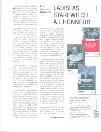 « Loué soit le travail de Léona Béatrice Martin-Starewitch et François Martin, qui, depuis des années, s’attellent à faire revivre la production de Ladislas Starewitch (1882-1965), restaurant et diffusant les œuvres, mettant en valeur les archives non-films, créant un site dédié au réalisateur polonais né à Moscou et installé en France dans les années vingt.En comptant quelques réalisations inachevées, Starewitch a réalisé une centaine de films entre la Russie (64 entre 1909 et 1919) et la France. La Filmographie raisonnée que publie le couple Martin décrit cet ensemble en détails en scindant les périodes russe et française. Elle repose sur le dépouillement de multiples sources, les films quand ils existent, complets ou incomplets, retrouvés dans telle ou telle archive, et toute autre information écrite. Ces recoupements leur permettent d’affiner au mieux les données disponibles sans jamais omettre de signaler manques et incertitudes.