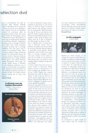 Starewitch qui avait 35 ans lors de la révolution de 1917, vécut les événements majeurs du XXème siècle sans que rien ou presque ne paraisse dans son œuvre. De cette période date pourtant Vers le Pouvoir populaire (23 minutes), film d’éducation civique (sans animation), totalement atypique autour d’un complot ourdi par un directeur d’usine contre un responsable politique, le but étant de rappeler leur devoir aux citoyens au moment d’une élection. Dans Cagliostro (1918, 36 minutes) qui commence comme « kitscherie » égyptienne, on note le soin apporté aux ambiances et aux lumières de cette histoire de sorcellerie. D’autres inédits du début des années 1910 – parfois de qualité moyenne car repris de copies numériques – sont proposées, comme Le Voyage sur la Lune (1912), dix ans après Méliès ! On redécouvre avec plaisir une copie restaurée de La Revanche du ciné-opérateur (1912), abracadabrante histoire d’héritage jouée par des insectes dont l’un est cinéaste, véritable déclaration d’amour de l’auteur à son métier. » Bernard Génin, Positif, n° 755 janvier 2024, p. 78-79.