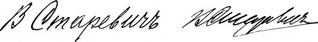 Le formulaire de l’acte de mariage est imprimé en russe. L’écriture manuscrite utilise la langue russe retranscrite de manière phonétique avec l’alphabet latin ce qui témoigne de l’époque durant laquelle l’usage du lituanien restait interdit. Cette écriture est appelée Grazhdanka. Ladislas Starewitch signe les documents officiels en utilisant cette écriture.